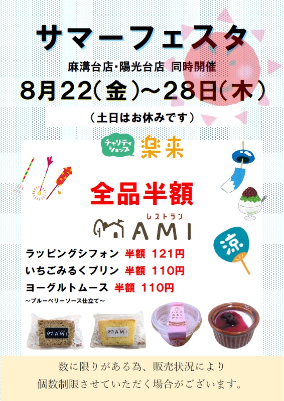 サマーフェスタのお知らせ 公開日: 2025年8月7日更新日: 2025年8月7日著者: 社会福祉法人らっくあみAMIブログのカテゴリ: お知らせ, ブログ 8月22日(金)から8月28日(木)まで、サマーフェスタを開催します。 是非、ご来店ください。
