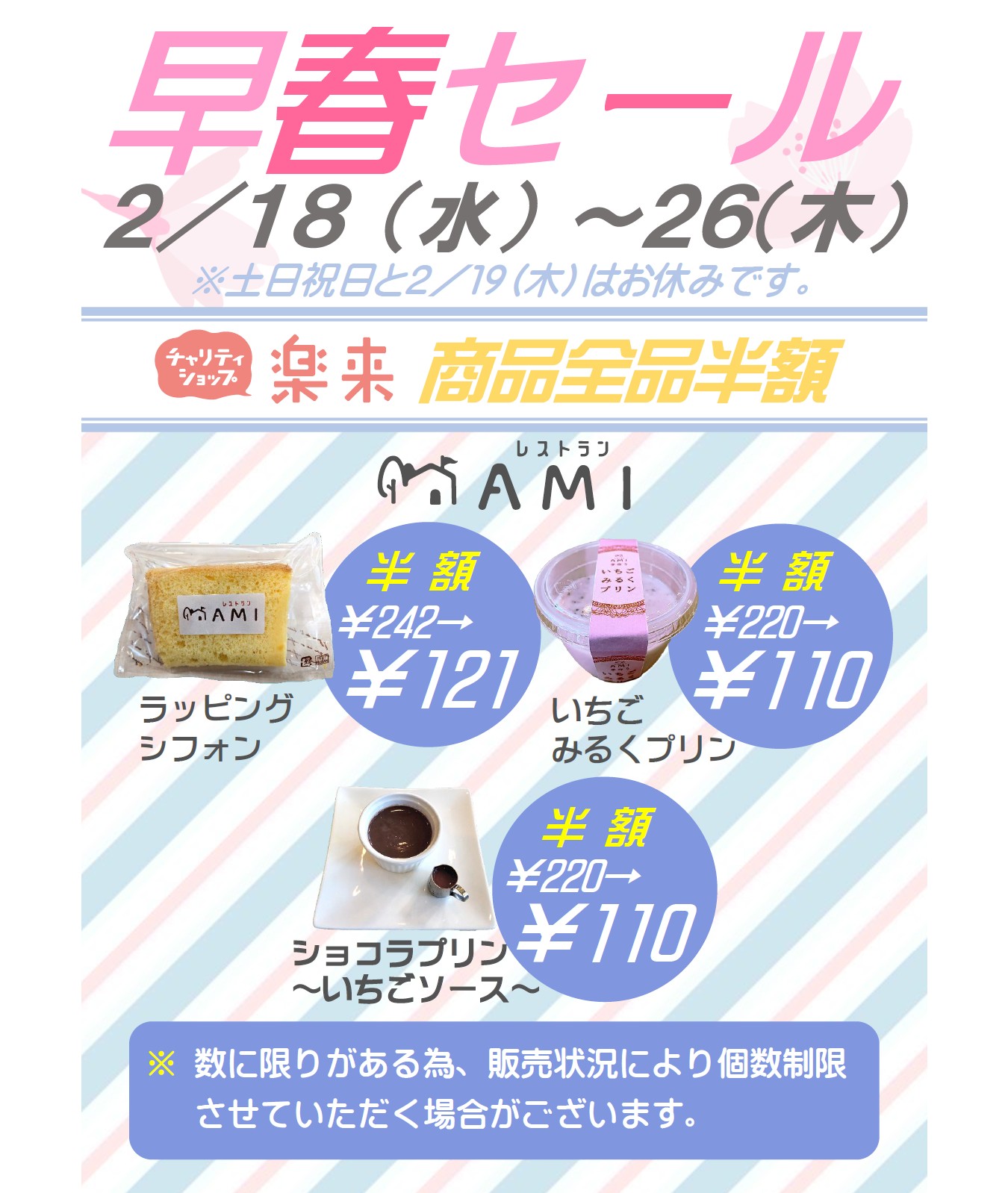 早春セールのお知らせ 公開日: 2026年2月5日更新日: 2026年2月5日著者: 社会福祉法人らっくあみAMIブログのカテゴリ: お知らせ, ブログ 2月18日(水)から2月26日(木)まで、早春セールを開催します。(土日祝日と2月19日(木)を除く) 是非、ご来店ください。