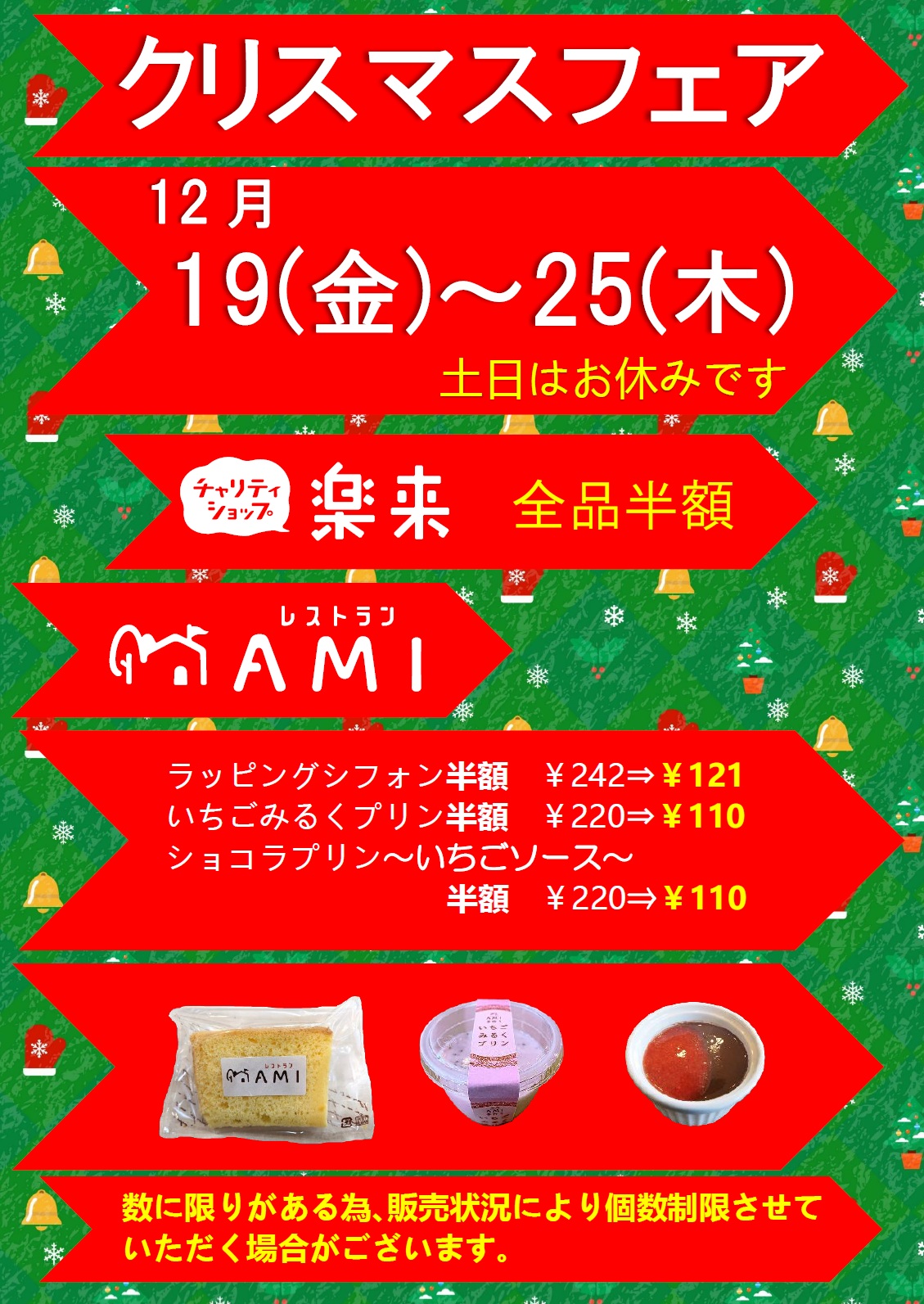 クリスマスフェアのお知らせ 公開日: 2025年12月1日更新日: 2025年12月1日著者: 社会福祉法人らっくあみカテゴリー: お知らせ, ブログ 12月19日(金)から12月25日(木)まで、クリスマスフェアを開催します。 ※土日はお休みです。 是非、ご来店ください。 この投稿へのトラックバック トラックバックはありません。 トラックバック URL
