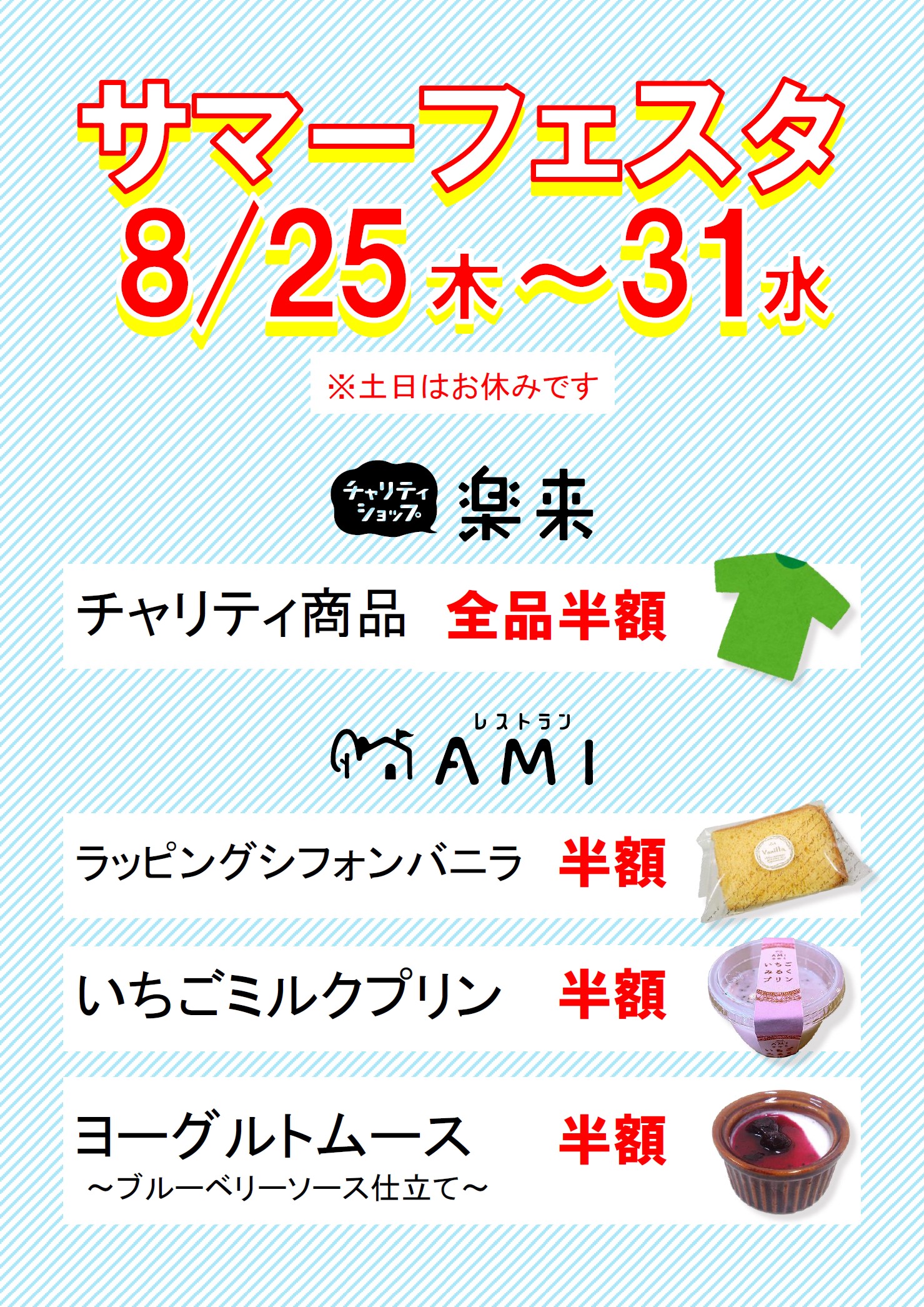 サマーフェスタのお知らせ 公開日: 2022年8月17日更新日: 2022年8月17日著者: 社会福祉法人らっくあみカテゴリー: お知らせ, ブログ 8月25日(木)から8月31日(水)まで、サマーフェスタを開催します。(土日除く) 是非、ご来店ください。 この投稿へのトラックバック トラックバックはありません。 トラックバック URL