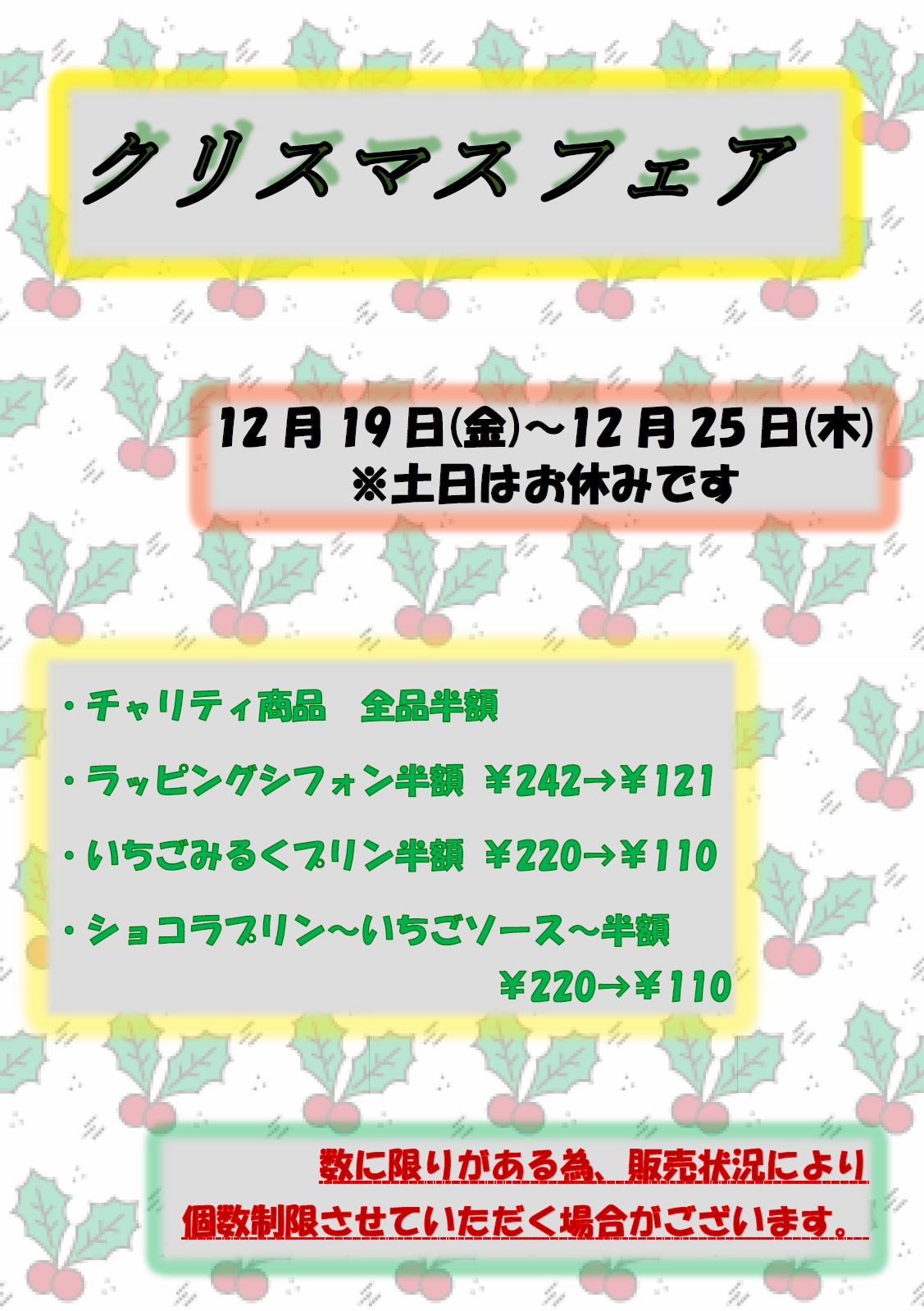 クリスマスフェアのお知らせ 公開日: 2025年12月1日更新日: 2025年12月1日著者: 社会福祉法人らっくあみ楽来ブログのカテゴリ: お知らせ, ブログ 12月19日(金)から12月25日(木)まで、クリスマスフェアを開催します。(土日除く) 是非、ご来店ください。