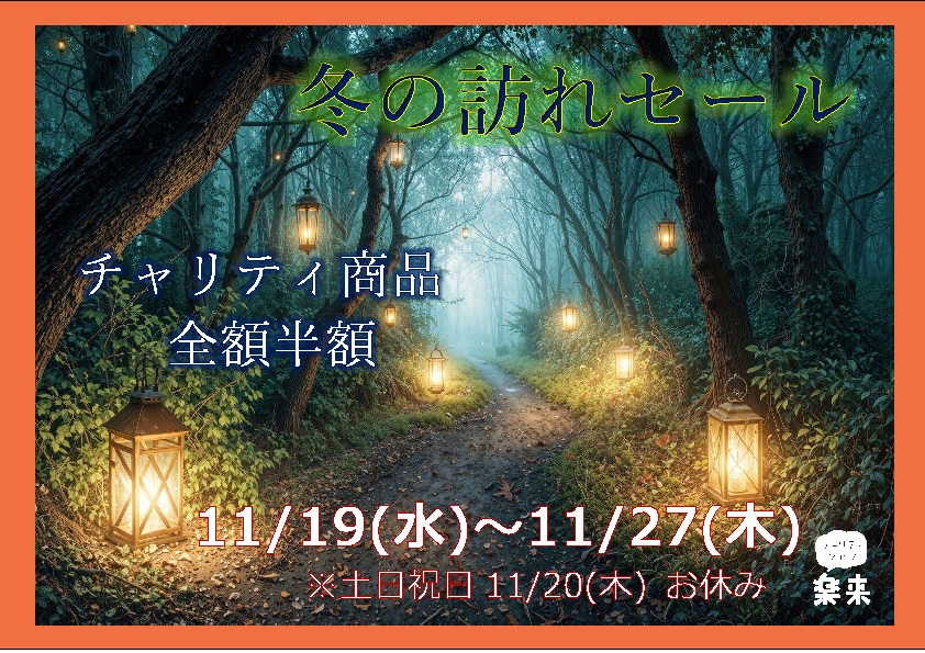 冬の訪れセールのお知らせ 公開日: 2025年11月10日更新日: 2025年11月10日著者: 社会福祉法人らっくあみ楽来ブログのカテゴリ: お知らせ, ブログ 11月19日(水)から11月27日(木)まで、冬の訪れセールを開催します。 (土日祝日・11/20(木)を除く) 是非、ご来店ください。